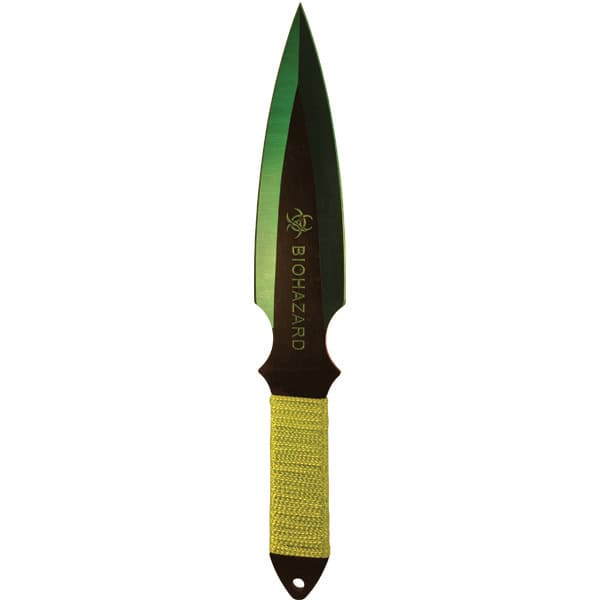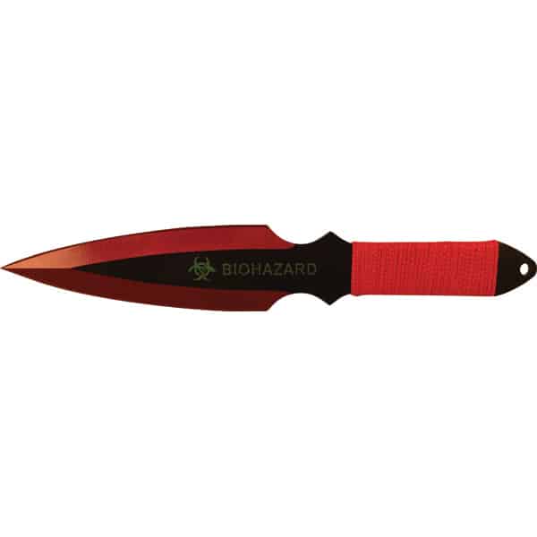 2 Piece Throwing Knife BioHazard. 9" Length, 2 Piece Set, made from 440 stainless steel, great beginner to intermediate throwing knife. Includes sheath pouch for knives.