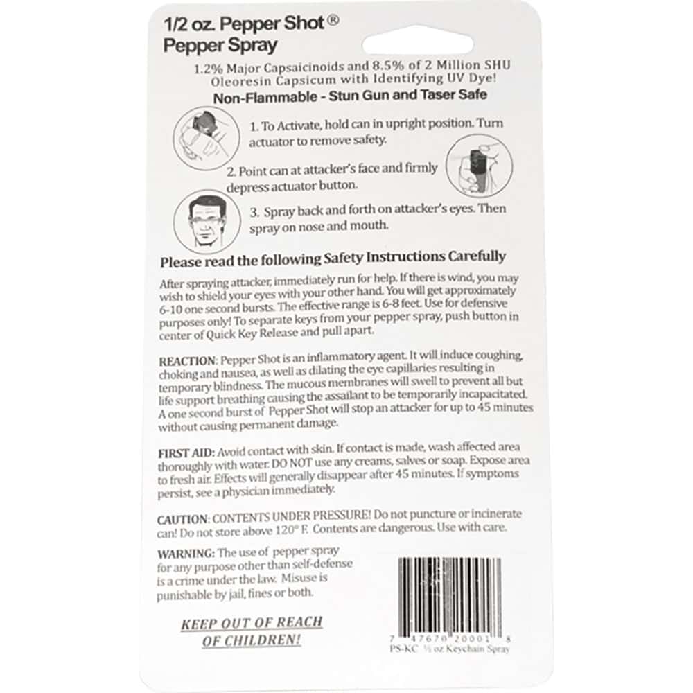 Pepper Shot 1.2% MC ½ oz pepper spray belt clip and quick release keychain. Pepper Shot Pepper Spray is made with 1.2% Major Capsaicinoids. The Major Capsaicinoids are the true heat measure and Pepper Shot 1.2% MC is more effective than of most other pepper sprays. In addition to causing an attacker pain, The Pepper Shot 8.5% oleoresin capsicum formula swells the mucous membranes, which makes breathing difficult, and swells the veins in the eyes, causing the eyes to close. It's made from 2,000,000 SHU's of raw pepper and these effects can last up to 45 minutes and cause no permanent damage. Has a UV identifying dye to help aid in the identification of an attacker. ½ oz keychain model with locking actuator and quick release keychain.
