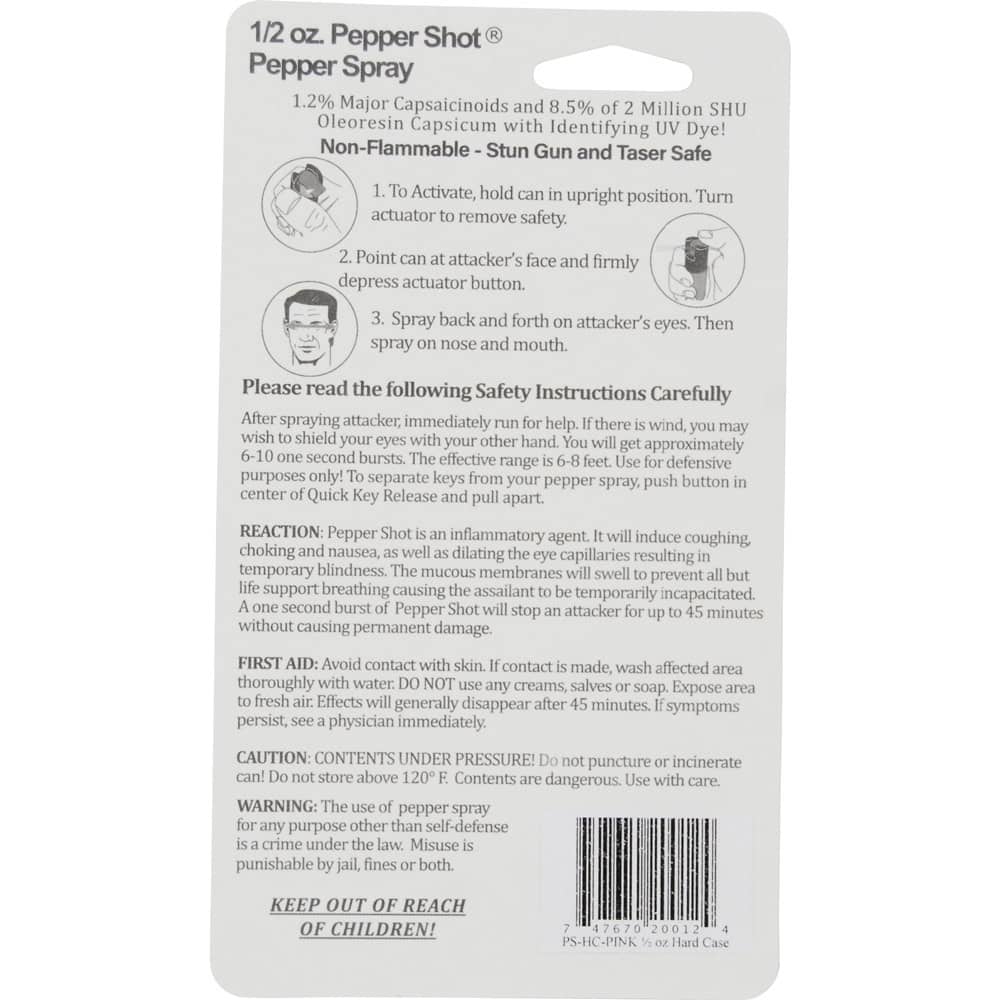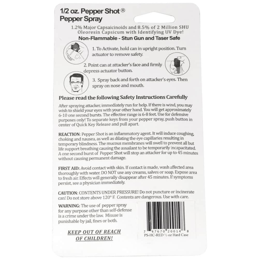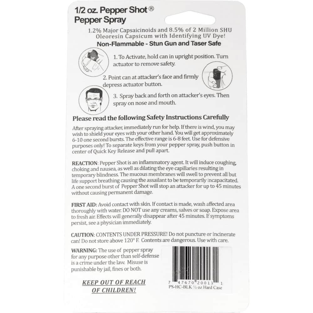 Pepper Shot 1.2% MC ½ oz pepper spray hard case belt clip and quick release keychain black. Pepper Shot Pepper Spray is made with 1.2% Major Capsaicinoids. The Major Capsaicinoids are the true heat measure and Pepper Shot 1.2% MC is more effective than of most other pepper sprays. In addition to causing an attacker pain, The Pepper Shot 8.5% oleoresin capsicum formula swells the mucous membranes, which makes breathing difficult, and swells the veins in the eyes, causing the eyes to close. It's made from 2,000,000 SHU's of raw pepper and these effects can last up to 45 minutes and cause no permanent damage. Has a UV identifying dye to help aid in the identification of an attacker.