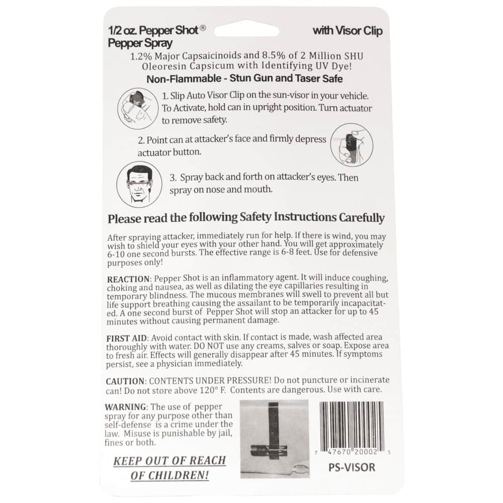 Pepper Shot 1.2% MC 1⁄2 oz w/auto visor clip. Pepper Shot Pepper Spray is made with 1.2% Major Capsaicinoids. The Major Capsaicinoids are the true heat measure and Pepper Shot 1.2% MC is more effective than of most other pepper sprays. In addition to causing an attacker pain, The Pepper Shot 8.5% oleoresin capsicum formula swells the mucous membranes, which makes breathing difficult, and swells the veins in the eyes, causing the eyes to close. It's made from 2,000,000 SHU's of raw pepper and these effects can last up to 45 minutes and cause no permanent damage. Has a UV identifying dye to help aid in the identification of an attacker. This is one of our most popular pepper sprays. It fits on the visor of your vehicle, giving you pepper protection where you need it the most.