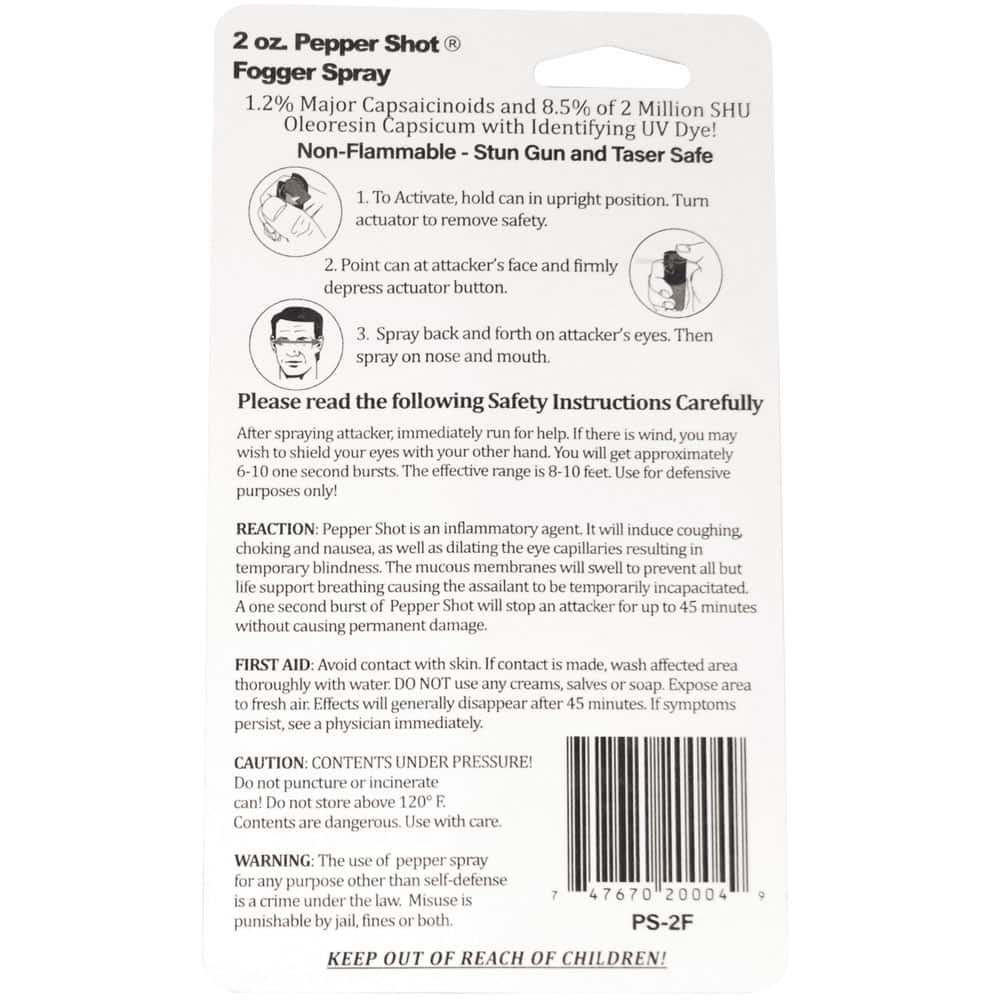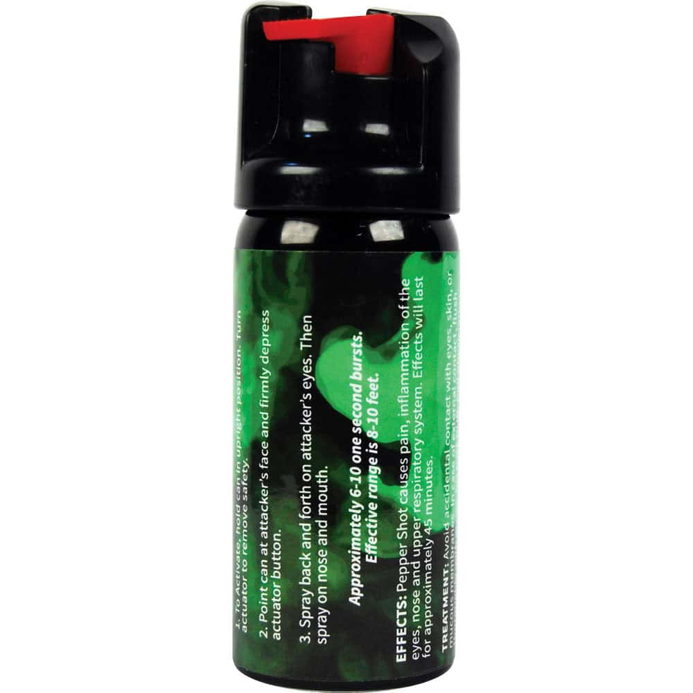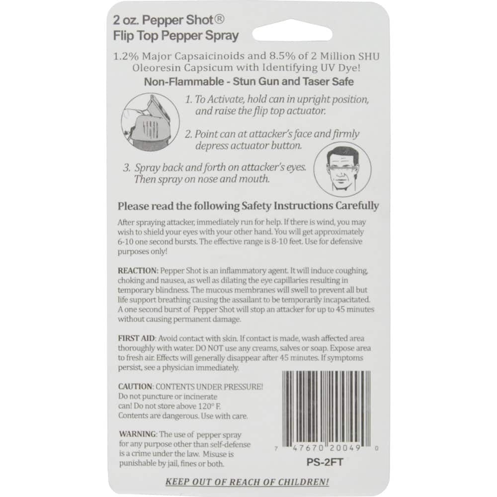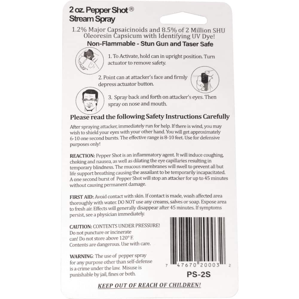 Pepper Shot 1.2% MC 2 oz pepper spray. Pepper Shot Pepper Spray is made with 1.2% Major Capsaicinoids. The Major Capsaicinoids are the true heat measure and Pepper Shot 1.2% MC is more effective than of most other pepper sprays. In addition to causing an attacker pain, The Pepper Shot 8.5% oleoresin capsicum formula swells the mucous membranes, which makes breathing difficult, and swells the veins in the eyes, causing the eyes to close. It's made from 2,000,000 SHU's of raw pepper and these effects can last up to 45 minutes and cause no permanent damage. Has a UV identifying dye to help aid in the identification of an attacker. Our 2 oz Pepper Shot is perfect for home use or carrying on your belt with the leatherette holster with belt clip.