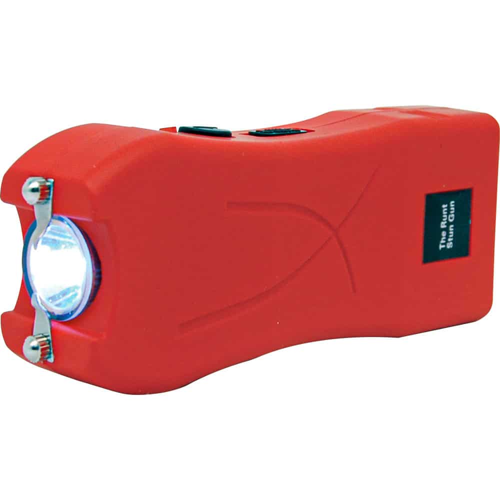 The rechargeable RUNT 80,000,000 volt stun guns now have an LED flashlight and wrist strap disable pin. It's easily concealable, and virtually undetectable in the hand of a woman or a man. The Runt uses a new cutting edge micro-technology to deliver super powered protection. You can carry the Runt in your hand or pocket. It also has a rubberized coating for a better grip. If you would like to wear it like a cell phone there is a heavy duty nylon belt loop holster included.